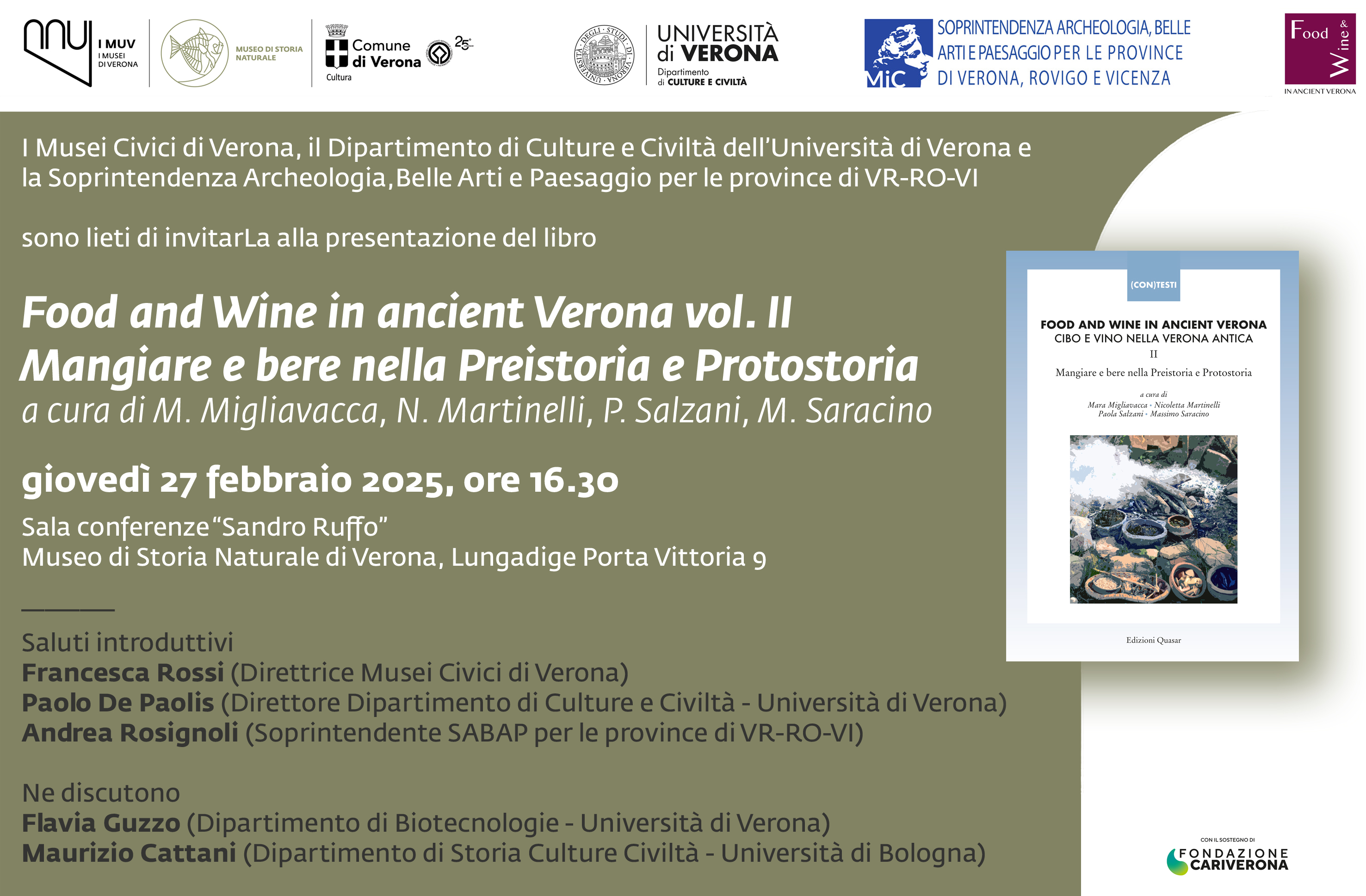 La presentazione segue a breve distanza quella del primo volume, svoltasi lo scorso dicembre nella sede dell’Accademia di Agricoltura, Scienze e Lettere. Questa seconda pubblicazione contiene una serie di contributi che, rispetto al primo volume, si concentra sulla preistoria e protostoria veronese, aggiungendo un importante tassello al progetto complessivo. In questa occasione alcuni risultati del progetto Food and wine in ancient Verona sono stati integrati con una ricca serie di importanti dati scaturiti da altre indagini in corso da parte di enti di ricerca da anni impegnati sul territorio, il cui tratto comune risiede nell’inter- e multidisciplinarietà e nell’impiego di metodologie scientifiche complesse e diversificate.