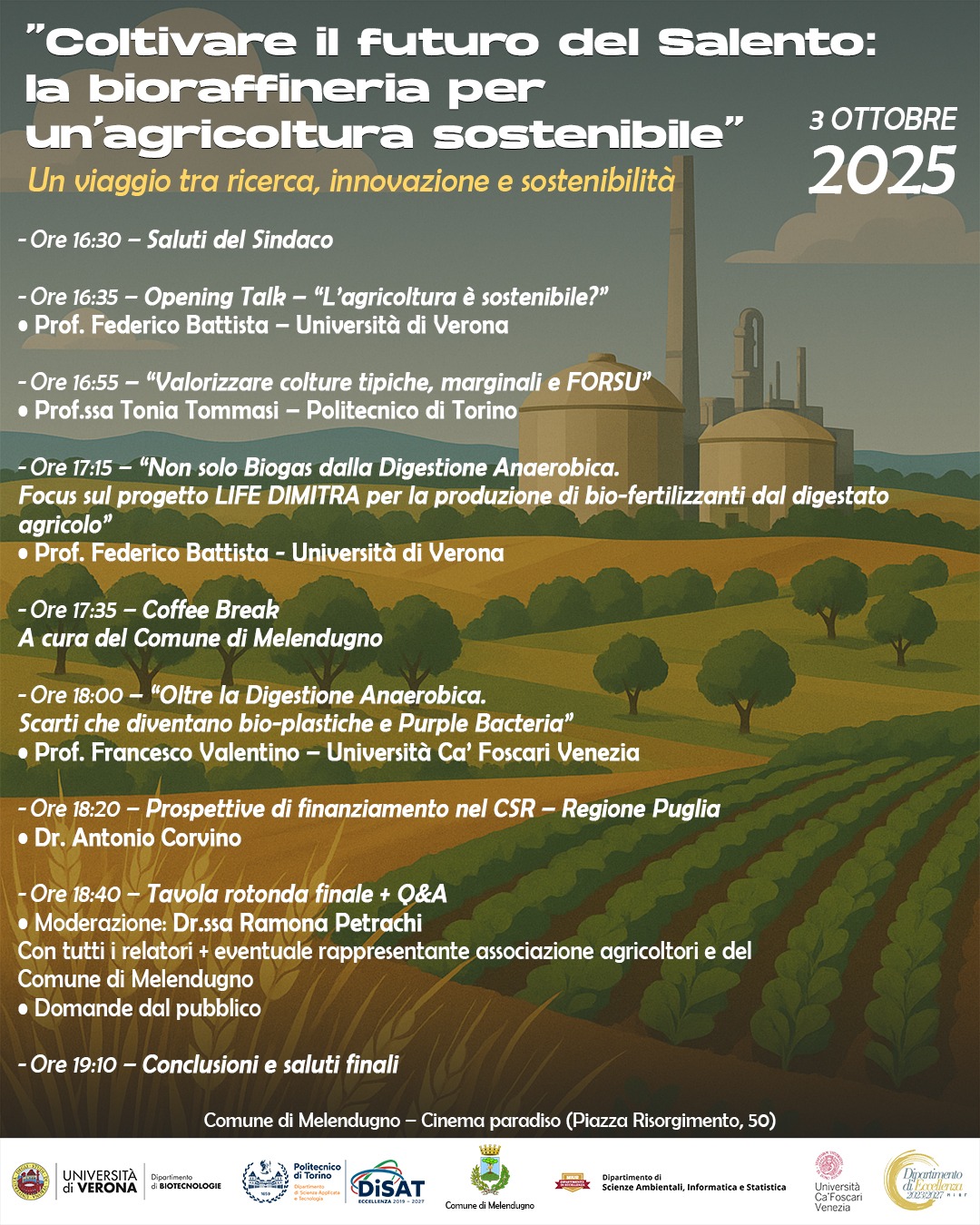 Coltivare il futuro del Salento: la bioraffineria per un'agricoltura sostenibile è un evento divulgativo organizzato dal Comune di Melendugno e dall’Università di Verona, che vede la partecipazione altri atenei italiani, quali il Politecnico di Torino e l'Università Ca' Foscari di Venezia. La conferenza si terrà il 3 ottobre 2025 presso il Comune di Melendugno. L’iniziativa mira a promuovere conoscenze scientifiche sull’economia circolare e le bioraffinerie, presentando esempi concreti legati al territorio salentino: dagli scarti dell’olio d’oliva e del vino fino alla FORSU e al digestato agricolo. L’obiettivo è sensibilizzare cittadini, agricoltori e giovani alle opportunità offerte dalla bioeconomia per uno sviluppo agricolo sostenibile. L’evento prevede interventi accademici, una tavola rotonda e un momento conviviale. Un’occasione unica per costruire sinergie tra ricerca, istituzioni locali e mondo agricolo, guardando insieme al futuro del Salento.