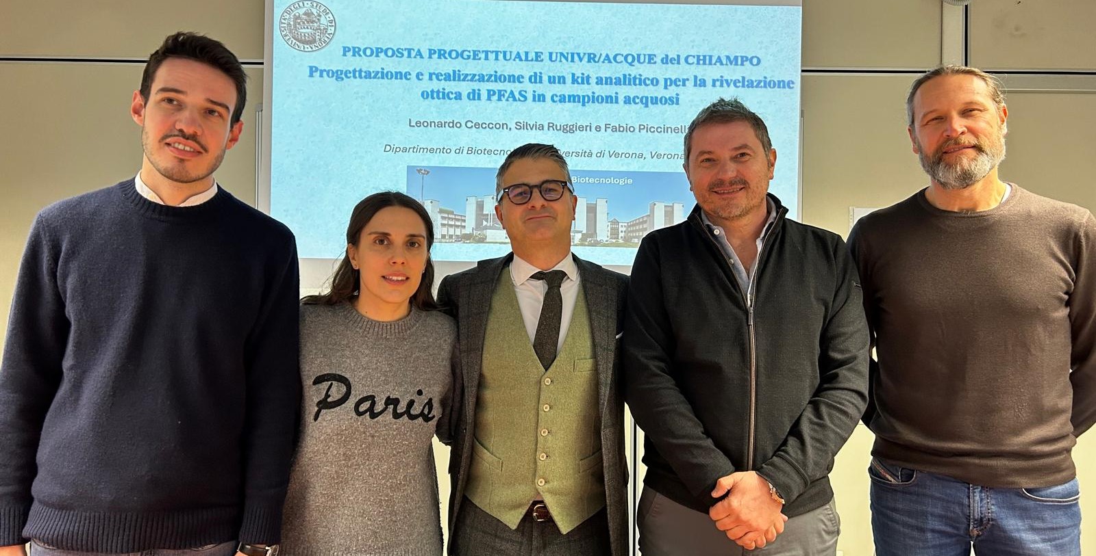 Il gruppo di ricerca “Laboratorio dei Materiali Luminescenti” coordinato dal Prof. Fabio Piccinelli, finanziato dall’azienda “Acque del Chiampo”, a partire da Febbraio 2026 ha iniziato un progetto di ricerca riguardante la rivelazione di inquinanti PFAS (sostanze alchilate per- e polifluorinate). Tale progetto, della durata di 18 mesi, ha come principale obiettivo quello di individuare una o più molecole a base di ioni lantanidi luminescenti, in grado di segnalare la presenza di diverse tipologie di PFAS, grazie a cambiamenti della risposta ottica legati alla interazione molecola luminescente/inquinante. I campioni analizzati saranno inizialmente soluzione standard di PFAS a varie concentrazioni per poi applicare i materiali ottici più promettenti a campioni reali di acqua potabile o di scarico. Il progetto si colloca nell’ambito di una collaborazione più ampia tra il Dipartimento di Biotecnologie e l’azienda “Acque del Chiampo” che mira a progettare ed applicare sonde ottiche per il riconoscimento selettivo e la quantificazione in loco di una vasta gamma di PFAS, per il monitoraggio in tempo reale di acque potabili, acque reflue e bacini idrici. Tale collaborazione prevede il coinvolgimento dei gruppi di ricerca di altri due docenti del Dipartimento di Biotecnologie: i Proff. Alessandra Bossi e Nicola Frison.